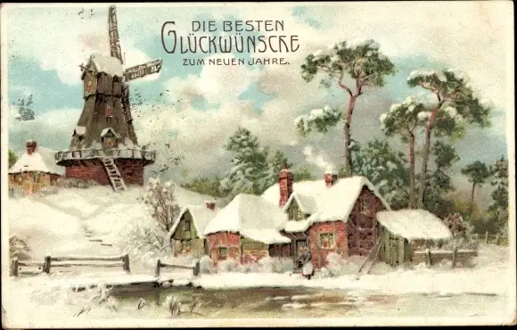 Litho Glückwunsch Neujahr, Dorfpartie, Windmühle