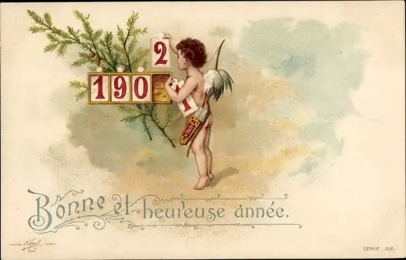 Litho Glückwunsch Neujahr, Engel, Amor, Jahreszahl 1902