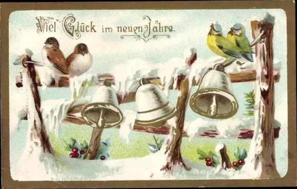 Litho Glückwunsch Neujahr, Glocken und Vögel auf einem Zaun
