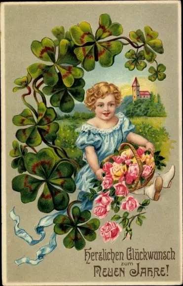 Litho Glückwunsch Neujahr, Kind, Rosenblüten, Kleeblätter