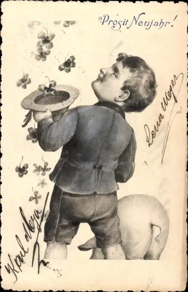 Litho Glückwunsch Neujahr, Kind mit Hund, Glücksklee, Schwein