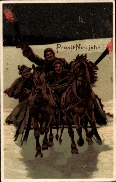 Litho Glückwunsch Neujahr, Personen in einem Schlittengespann