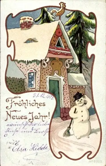 Litho Glückwunsch Neujahr, Schneemann, Haus