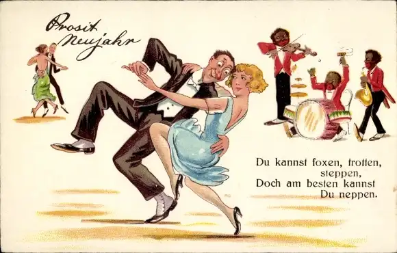 Litho Glückwunsch Neujahr, Tanzpaar, Du kannst foxen, trotten, sleppen, Humor