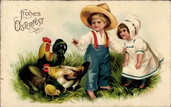 Litho Glückwunsch Ostern, Küken, Hahn, Huhn, Junge, Mädchen