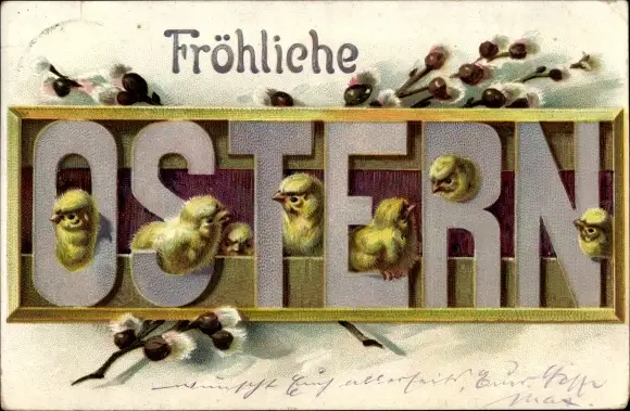 Litho Glückwunsch Ostern, Küken, Weidenkätzchen