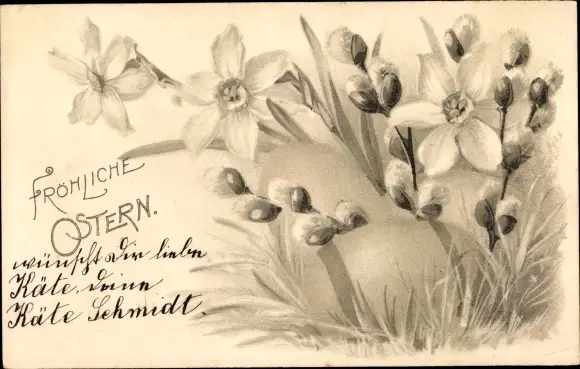 Litho Glückwunsch Ostern, Weidenkätzchen, Blumen, Ostereier