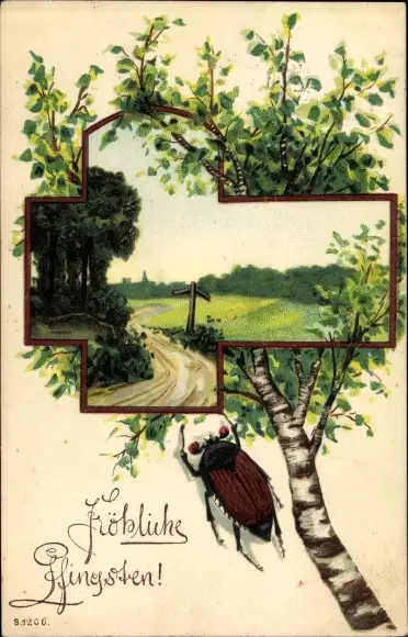 Litho Glückwunsch Pfingsten, Birke, Landschaft, Maikäfer