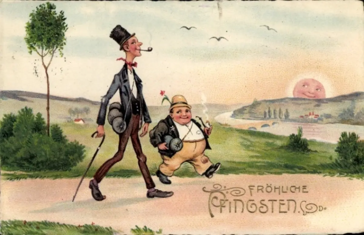 Litho Glückwunsch Pfingsten, Klein rund, groß schlank, zwei Wanderfreunde unterwegs
