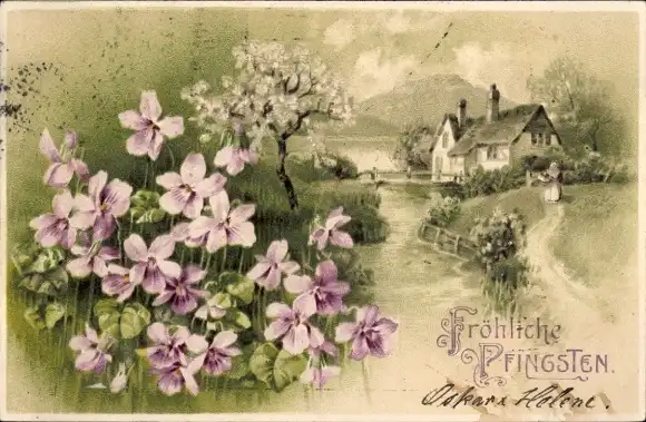 Litho Glückwunsch Pfingsten, Landschaft, Veilchen