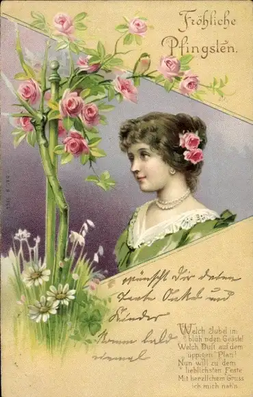 Litho Glückwunsch Pfingsten, Mädchen-Porträt, Blumen