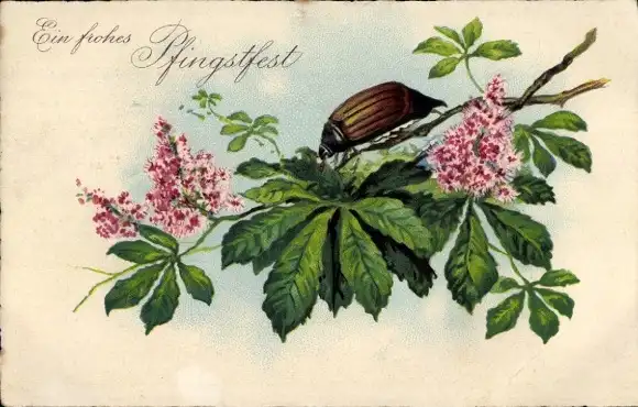 Litho Glückwunsch Pfingsten, Maikäfer, Kastanienblüten