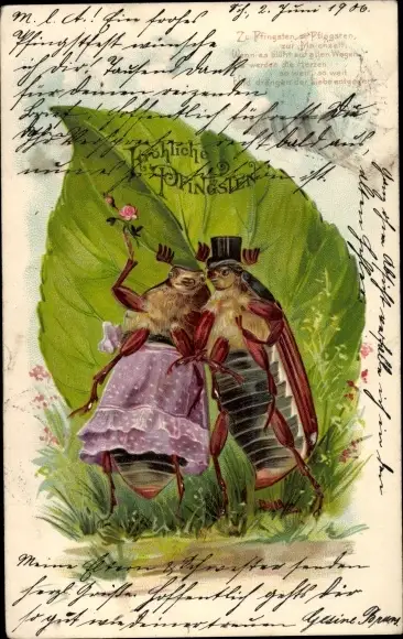Litho Glückwunsch Pfingsten, Maikäfer-Liebespaar, Laubblatt