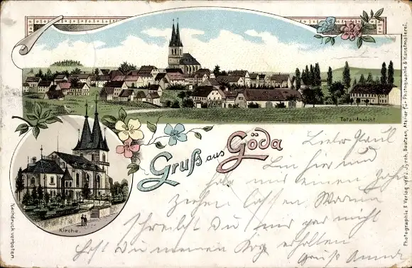 Litho Göda in der Oberlausitz, Gesamtansicht, Kirche