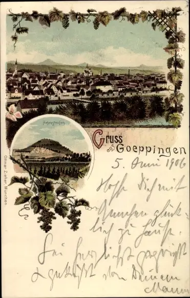 Litho Göppingen in Württemberg, Hohenstaufen, Blick auf den Ort