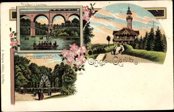 Litho Görlitz in der Lausitz, Viadukt, Springbrunnen im Stadtpark, Humboldt Denkmal, Weinberghaus