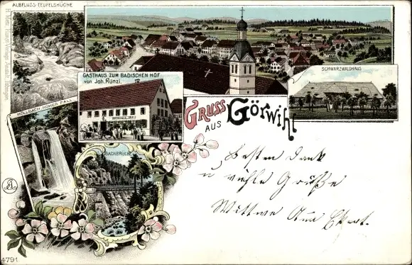 Litho Görwihl Schwarzwald, Gasthaus zum Badischen Hof, Schwarzwaldhaus, Wasserfall, Brücke