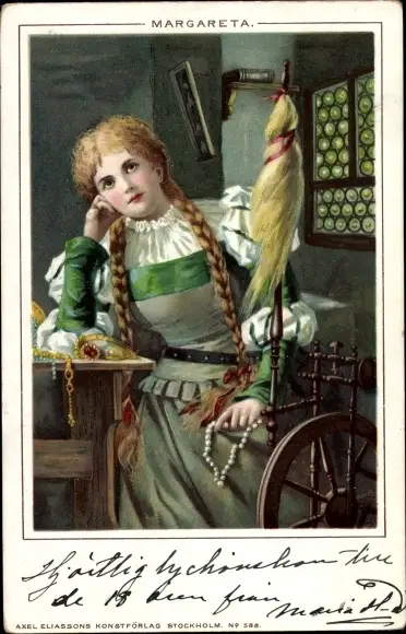 Litho Gretchen, Frau am Spinnrad, Szene aus Faust, Goethe