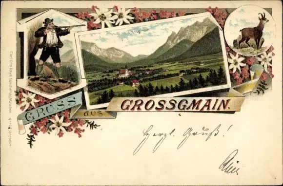 Litho Großgmain in Salzburg, Totalansicht, Jäger, Gämse