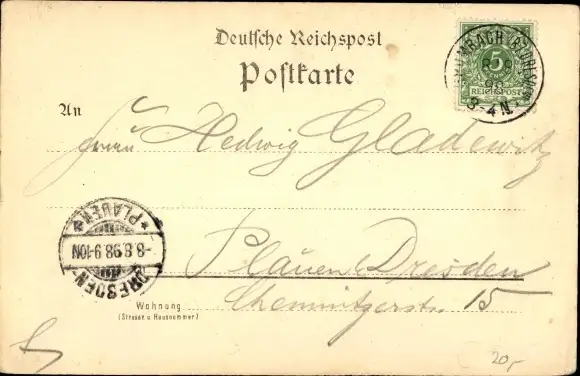 gelaufen 1898, Ecken und Kanten bestoßen, leicht fleckig, sonst guter Zustand - Inh.: A. Richter - Inh.: A. Richter
