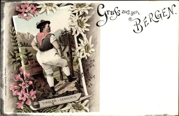 Litho Gruß aus Tirol, Tiroler Sennerin in Tracht, Edelweiß