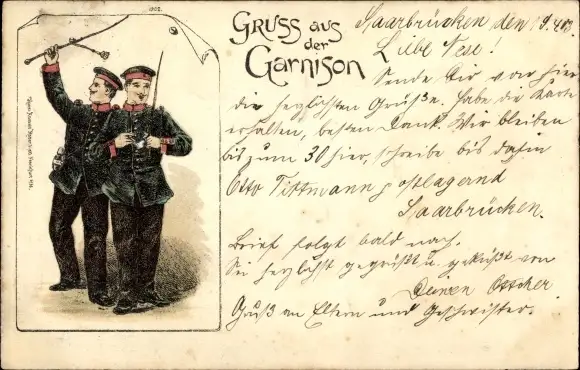 Litho Gruß aus der Garnison, Soldaten in Uniformen