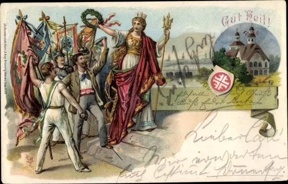 Litho Gut Heill, Turner mit Fahnen, Turnfest