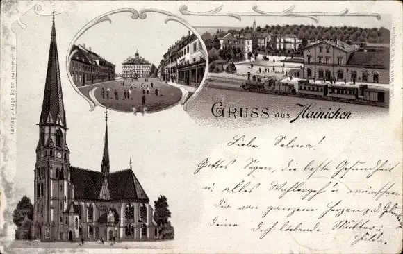 Litho Hainichen in Sachsen, Vorderansicht mit Kirche, Stadtansicht, Postkartenmotiv, Gründerzeita...