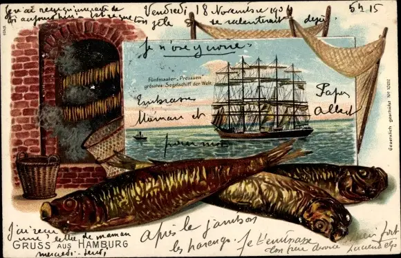 Litho Hamburg, Fünfmaster Preußen, Größtes Segelschiff der Welt, Räucherfisch