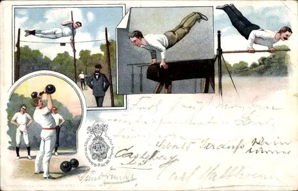 Litho Hamburg, IX. Deutsches Turnfest 1898, Turner, Stabhochsprung, Turnbock, Gewichtheber