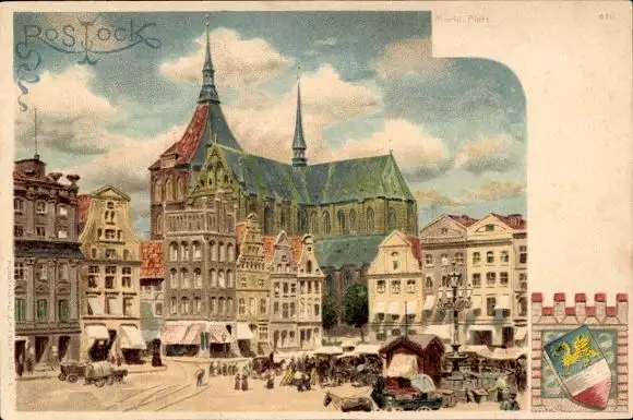 Litho Hansestadt Rostock, Marktplatz, Marienkirche, Wappen