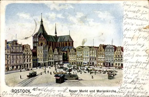 Litho Hansestadt Rostock, Neuer Markt, Marienkirche