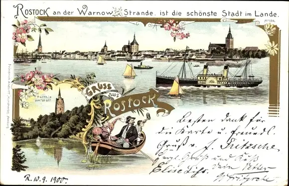 Litho Hansestadt Rostock, Warnow Strand, Wall, Dampfer