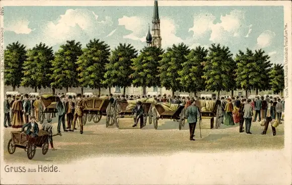 Litho Heide in Holstein, Marktplatz, Fuhrwerke