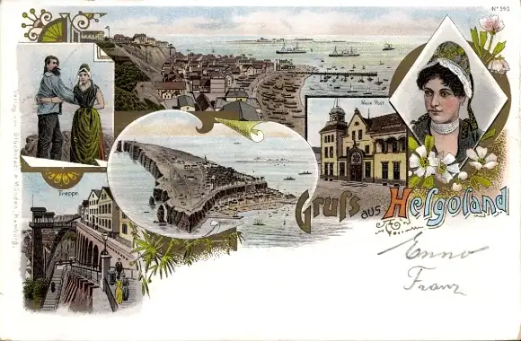 Litho Helgoland, Treppe, Post, Trachten, Tanz