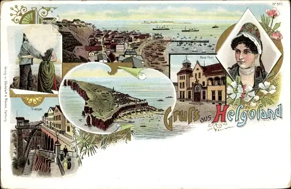 Litho Helgoland, Treppe, Post, Trachten, Tanz
