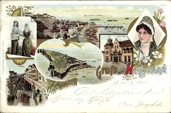 Litho Helgoland, Treppe, Post, Trachten, Tanz
