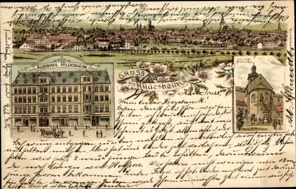 Litho Hildesheim in Niedersachsen, Kirche, Totalansicht, Geschäftshaus