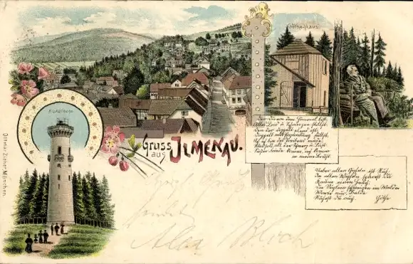 Litho Ilmenau Thüringen, Goethehaus, Kickelhahn, Ortsansicht