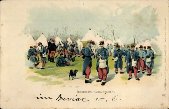 Litho-Infanterie, französische Soldaten in Uniform, Zelte