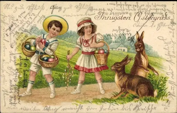 Litho Innigste Ostergrüße, Kinder mit Ostereierkörben, Hasen