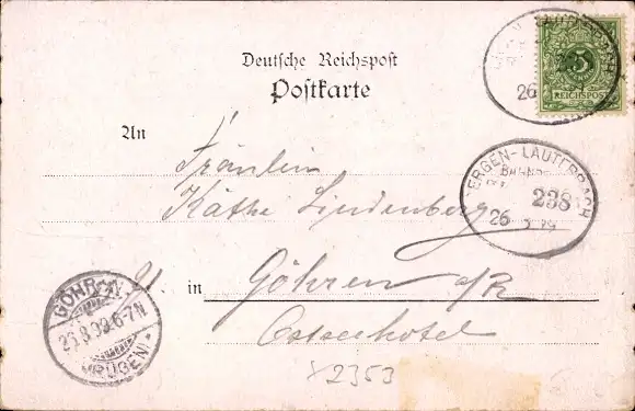 Zustand, siehe Scan, gelaufen, 1899- Bahnpoststempel Bergen - Lauterbach, Zug 238 - ca 15 cm X 9 cm