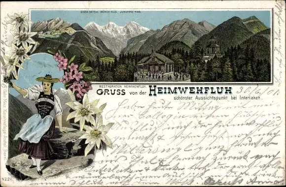 Litho Interlaken Kt. Bern Schweiz, Restaurant Heimwehfluh, Frau in Tracht, Edelweiß