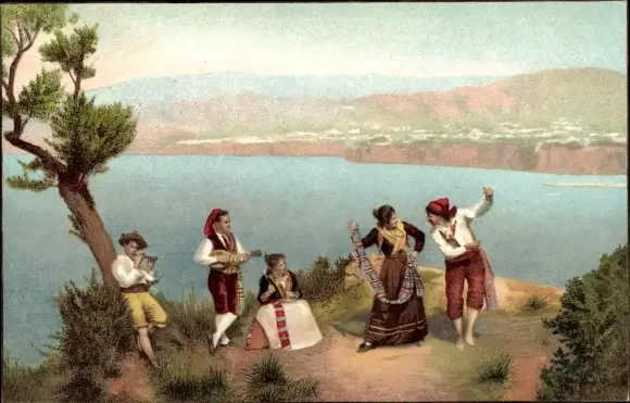 Litho Italien, Italiener in Trachten, Volkstanz, Meerblick, Stengel