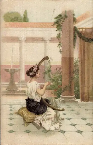 Litho Junge Frau spielt Harfe, Springbrunnen, Säulen