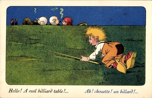 Litho Junge mit Billard Queue, Köpfe als Kugeln