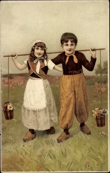 Litho Junge und Mädchen mit Holzschuhen