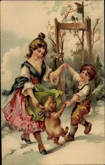 Litho Junge und Mädchen tanzen mit einem Schwein
