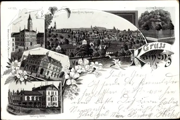 Litho Kamenz Sachsen, Lessing Denkmal, Rathaus, Postamt, Hutberg Hotel, Totalansicht