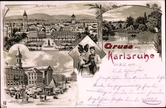Litho Karlsruhe in Baden, Badische Volkstracht, Markt, Stadtgarten, Totalansicht